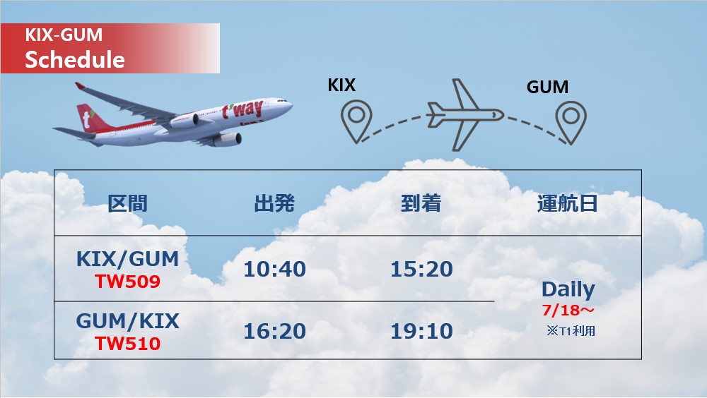 まず関西空港⇔グアムの就航スケジュールに関しましては7/18(金)よりデイリー運航となります。