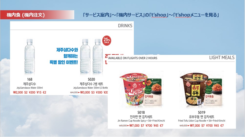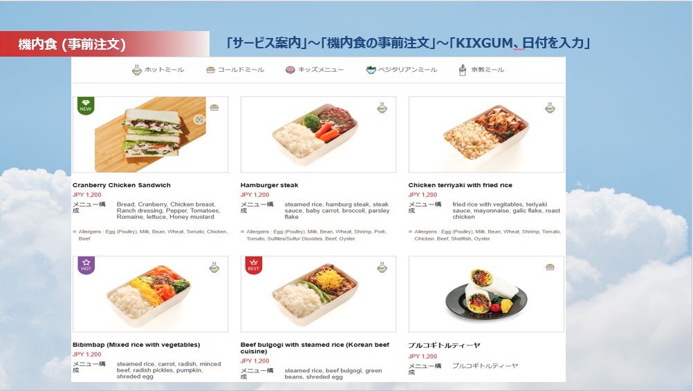 機内提供メニューは英語、韓国語となっております。