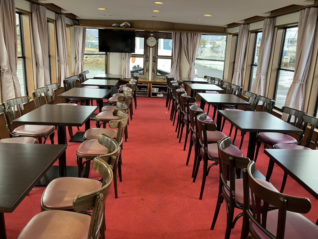 船内には、椅子・テーブルが設置されており、窓越しの席に座ると琵琶湖の景色が一面に広がります。