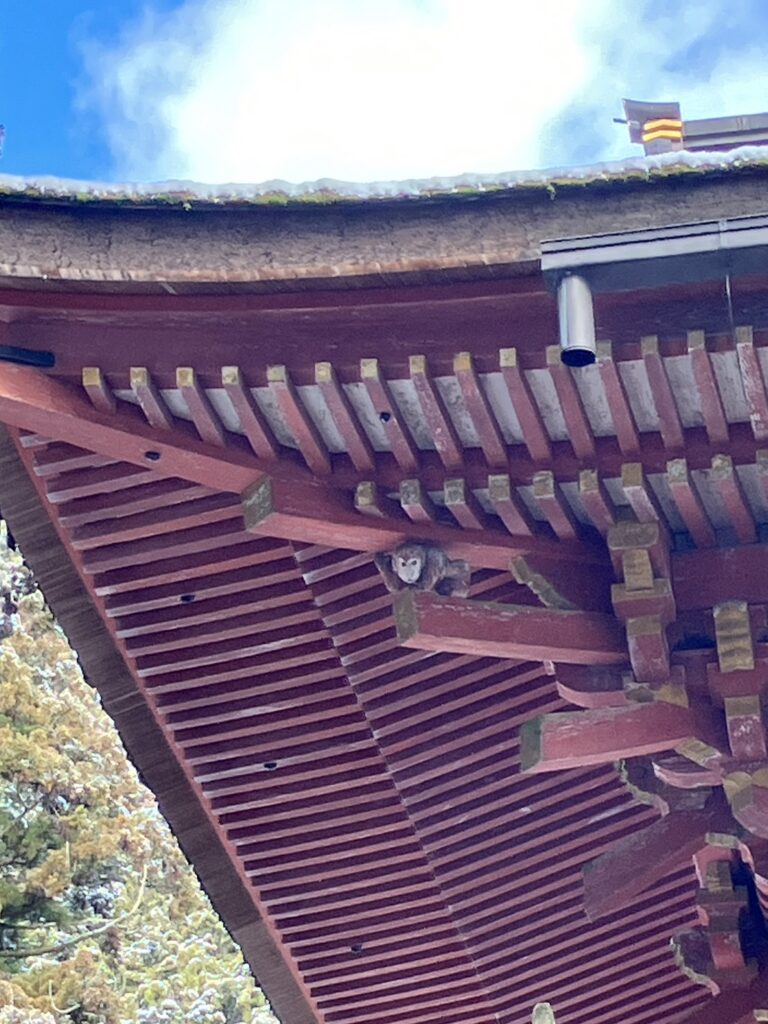 神社の屋根を見るとお猿さんがこちらを覗いていました。