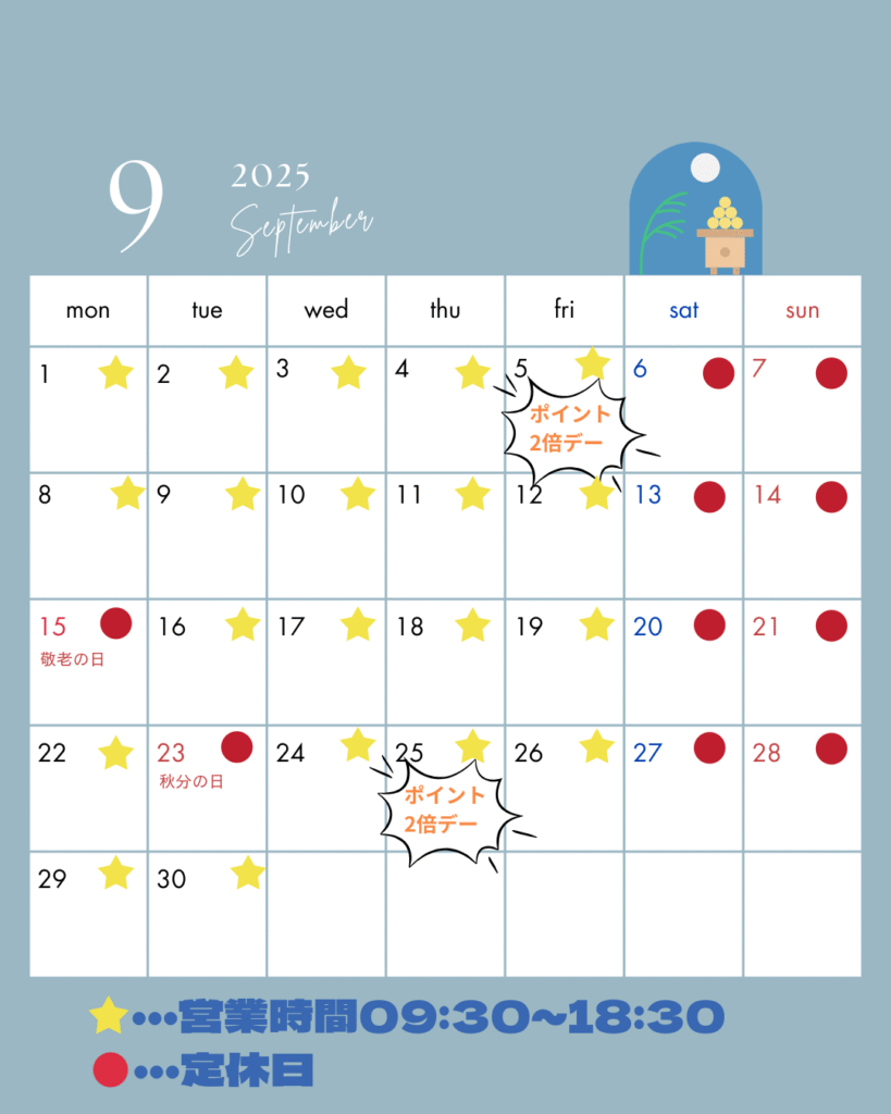9月の営業時間は、下記の通りとなります。